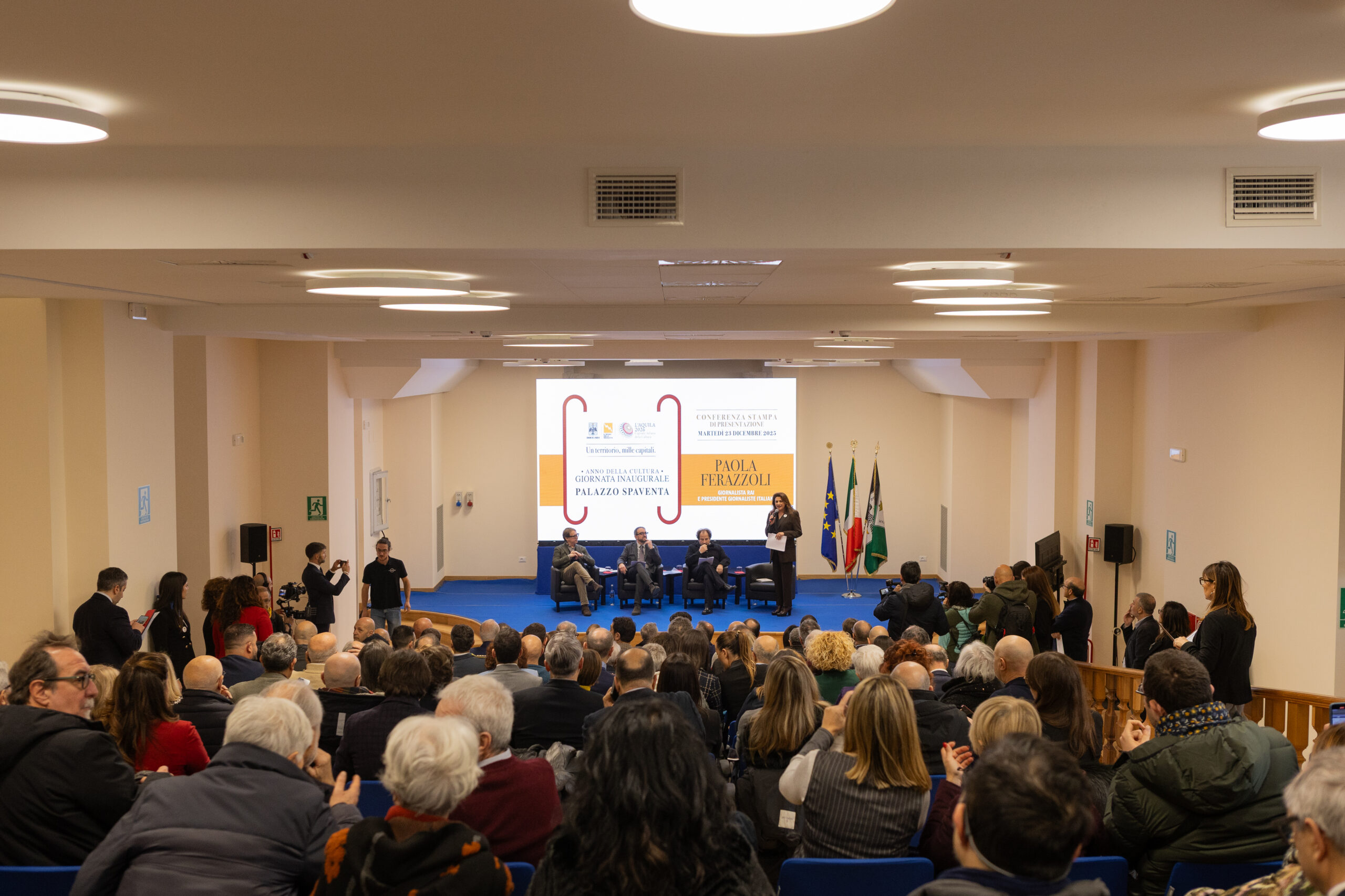L’Aquila, 23 dicembre 2025 – È stata presentata nella Sala Giovanni Paolo II di Palazzo Spaventa la cerimonia di inaugurazione dell’Aquila Capitale italiana della Cultura 2026, in programma sabato 17 gennaio 2026, con la cerimonia istituzionale del mattino, presso l’Auditorium della Scuola ispettori e sovrintendenti della Guardia di Finanza, e un ricco palinsesto di eventi pubblici nel pomeriggio e nella serata, diffusi nel centro storico della città.